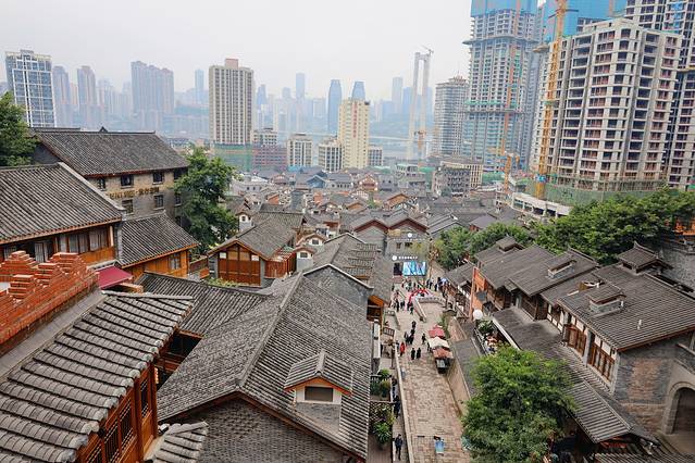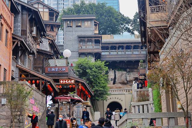 洪崖洞分十三层,层层叠加形成不同风格的街区,是地方传统特色建筑“吊脚楼”的形态,依山崖沿江而建。逛洪崖洞多少会有点迷失方向,但充满了无穷的乐趣,不管你是从底部还是顶部开始逛,都有扶梯或直达各层的观光电梯,只不过人多时直梯不太好乘坐。