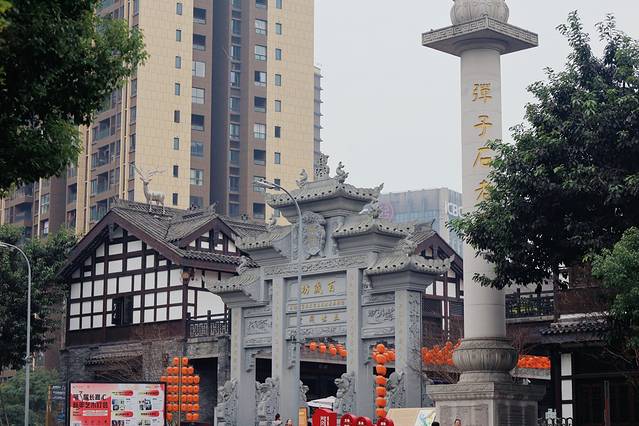 当我们在纠结去哪时,我提出要不就去弹子石看看?于是同意后我们打车前往目的地,当到达门口大牌坊时,看着这里还真挺复古的,原以为这里可能类似城中村的样貌。但司机说“还没到呢,还在前面”,下车后发现原来也是更新的街区,但它保留了很多川渝地区传统建筑手法,像筑台、悬挑、吊脚等,街区里吃玩项目挺多,面积不小有很多地方挺适合拍照的。