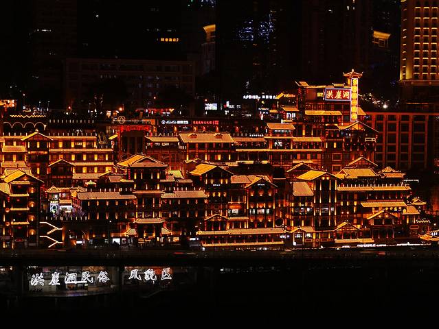 走在千厮门大桥上,脚下震动是一辆辆满载乘客的地铁穿江而过,眼前是灯火通明的城市夜景,江面上行驶着观光船看两岸灯光秀美,到头时就会看到主角“洪崖洞民俗风貌区”出现在面前。