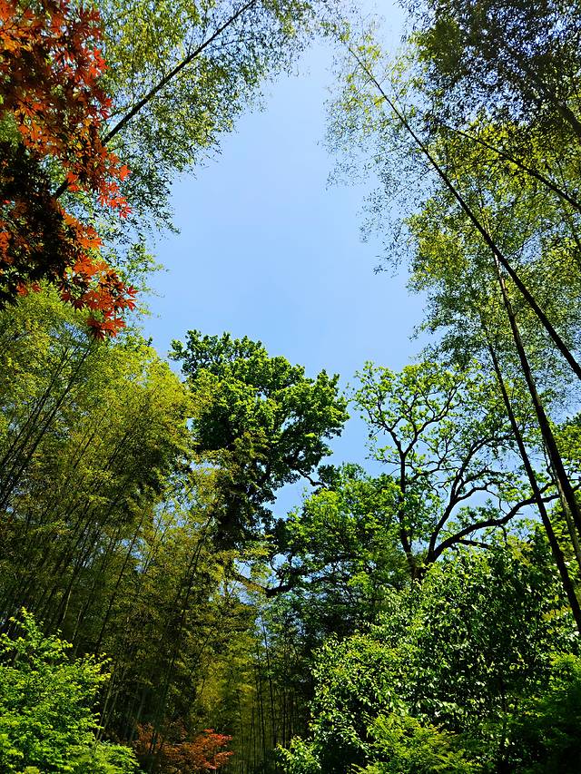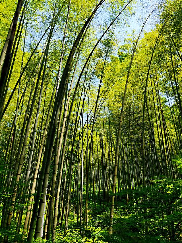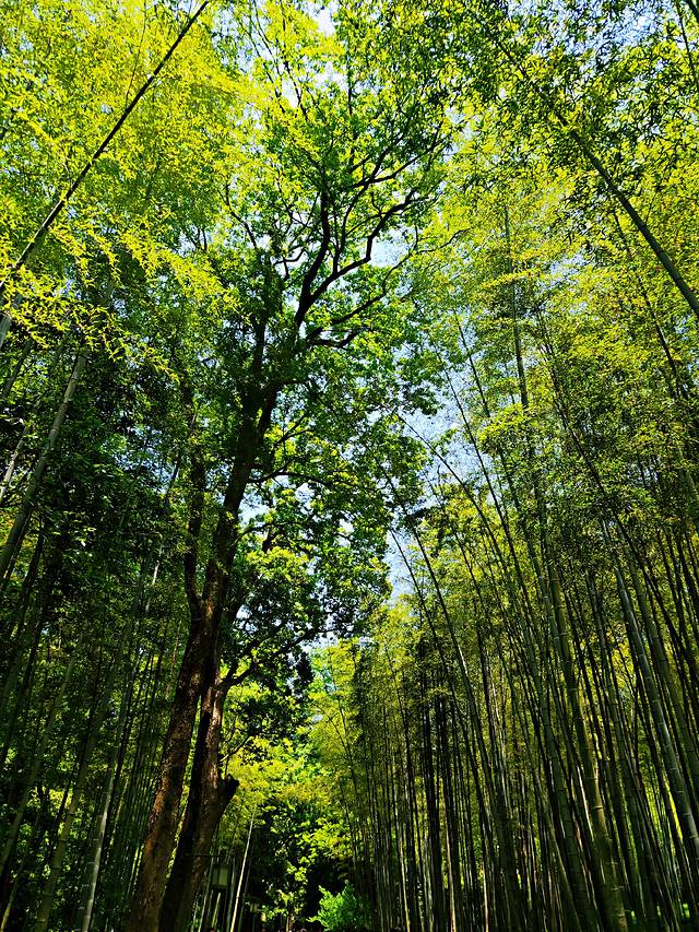 走入这片竹林里,仿佛世间所有的烦躁都一洗而空,留下的唯有恬静与舒适。没有五颜六色的花朵,唯有那满眼望不到头的碧绿,却没有让人感到一丝一毫的单调无味,唯有细细品味那跳动在绿色间变幻的美。