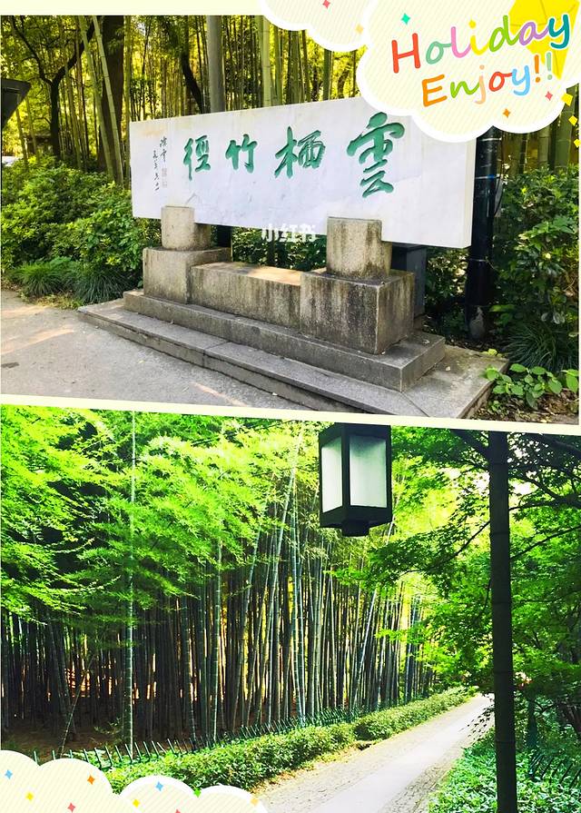 竹径入口有碑亭一座,上有陈云同志题写的"云栖竹径"四字。走进公园,一条长长的小道蜿蜒纵深,两旁翠竹成荫,娇婉动听的鸟声自林中传出,溪流叮咚,清凉无比,整个环境幽静清凉。