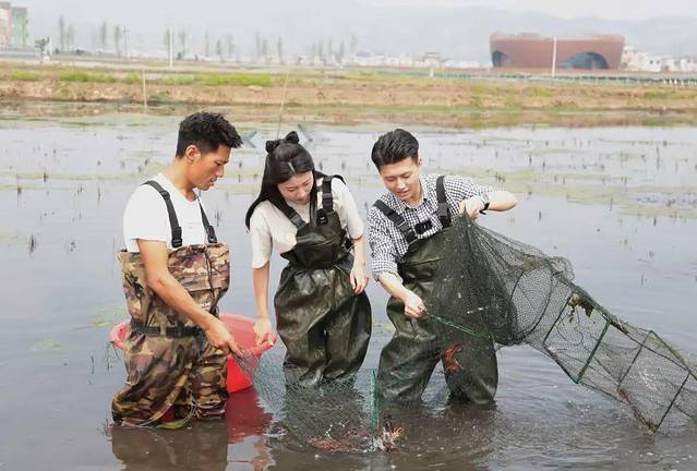 重点是还能亲自体验捕虾的乐趣哦,穿上专业的捕虾服装,和同学们一起下田装好渔网,就等龙虾上门啦~