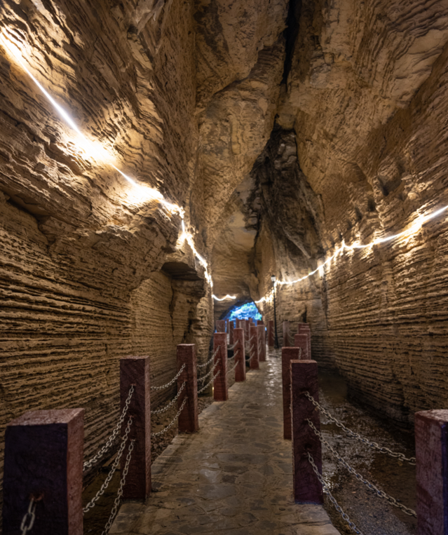在幽暗的暖黄色灯光下,洞中奇特的“千层岩”景观也完整的展现在我们眼前,石桥下还藏着一道悠悠暗河,所以连空气都是湿漉漉、凉丝丝的……