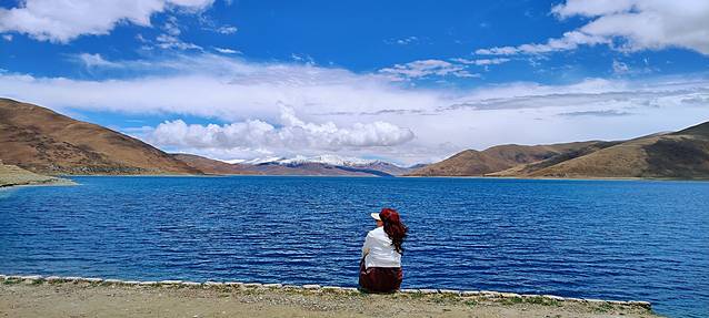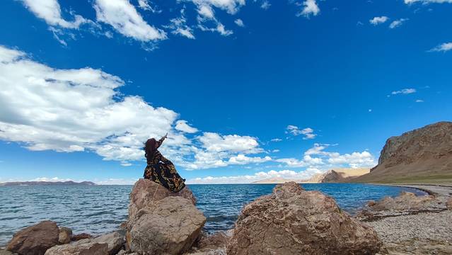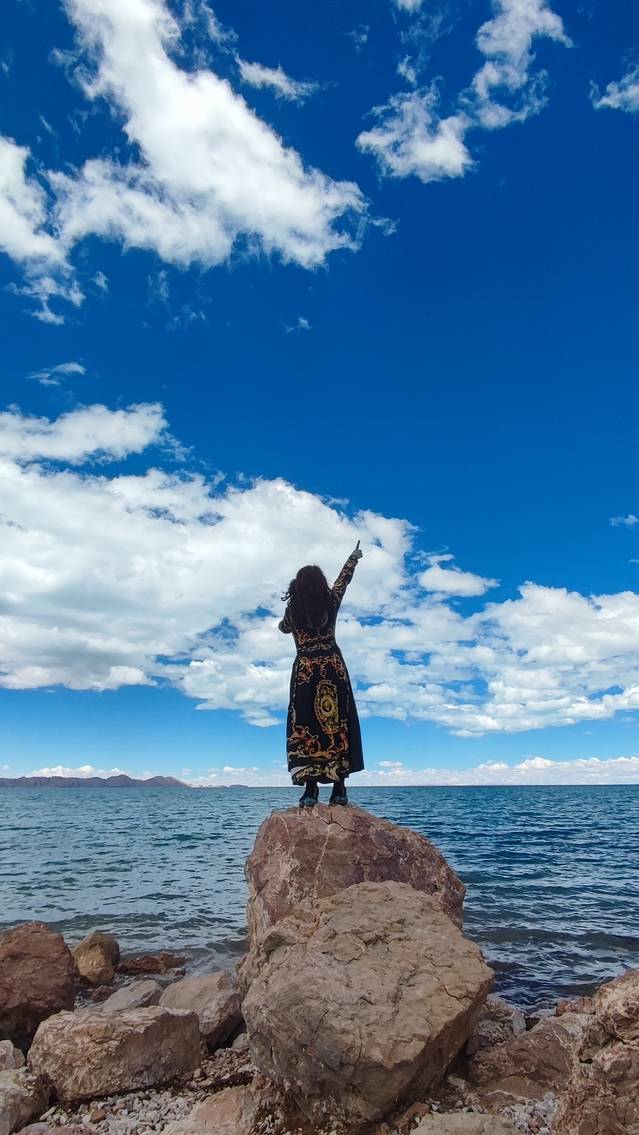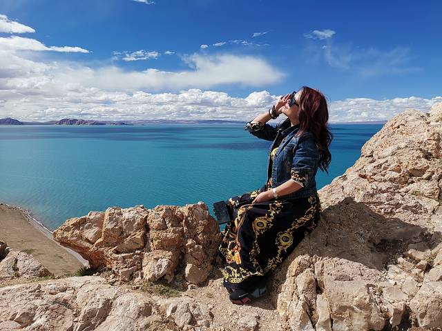 ✨我们到羊湖时,天气超好,蓝天白云把羊湖映衬得格外的美,我对着羊湖静静地发呆,享受此刻世间的美好,在羊湖周边有很多个观景平台可供欣赏羊湖美景,周边藏民还提供小羊羔,天空之镜等给游客做道具拍照,10元/人,拍出超美的效果,来这里你可借鉴来拍片一用,也可以帮助当地藏民赚点外快,毕竟高原生活也不容易,对于第一次见到羊湖的我已经沉醉在迷人的美景之中,不舍离开
