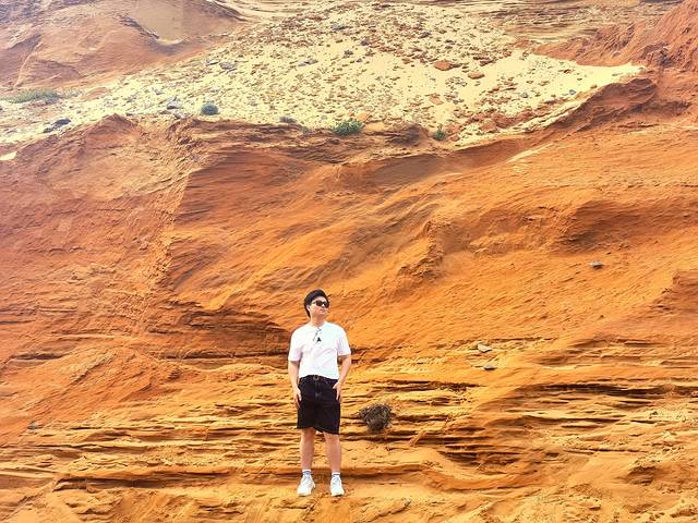沙地底,在 北港 村与长江澳中间,沿环岛路北行,在道路左侧看到一块有写着君山.....的大石头(非常明显)就拐上去,遇岔路即右行到底会看到一个小村子,就在村子旁边,其实就是个小黄土坡,一部分体现出丹霞地貌,拍照效果不错。