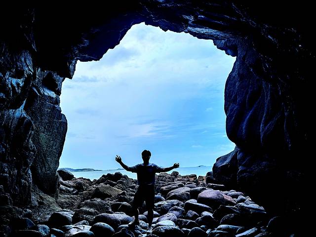 镜沙,在沙地底对面,原路下去直行看到写着“镜沙圣境”的门,直接一路往下到沙滩,因为到拍摄点还有一段不太好走的礁石路,下车后往左走到头,就会看到一个洞穴,要注意的是这个地方机位只够容纳一组拍摄,所以大概率要排很长时间,礁石上面海蟑螂不少,所以各位看情况做选择,如果单纯喜欢黑礁石的话,长江澳也是有的,但是就没有下图这种拍摄地点了。