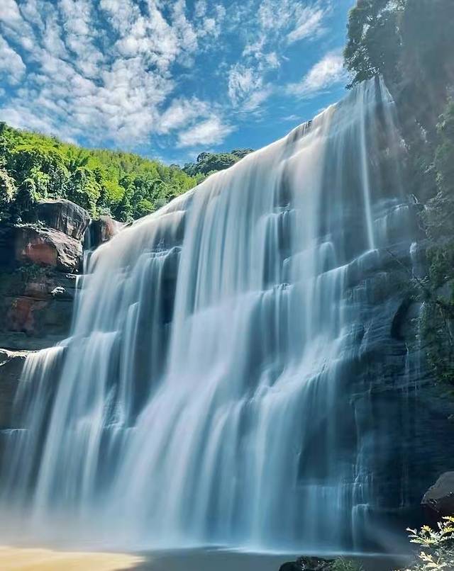 雾已散去,阳光也已经充足,瀑布离远一点看就像是一块块白色的绢布一样,洁白、无暇。虽然没有李白写的庐山瀑布那种飞流直下,当感觉赤水大瀑布更宽阔、更壮观。
