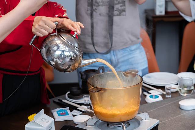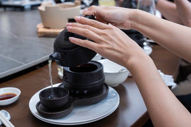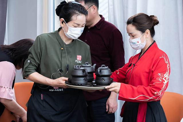一盏天姥功夫茶,选用的是鲍鱼、羊肚菌、里脊肉、鸡爪、桂圆、虫草花、竹荪等熬制四个小时而成,补中益气,可谓之“茶炉天姥客”。
