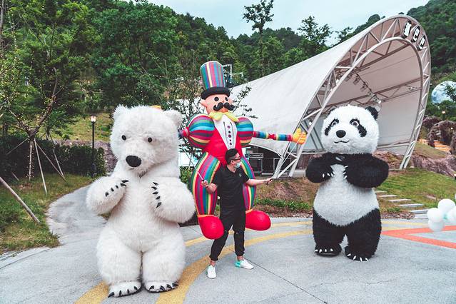 白天可以乘坐小火车畅游在绿水青山之中,体验野奢露营、精致下午茶、户外烤肉,还能跟大熊猫和白熊互动。