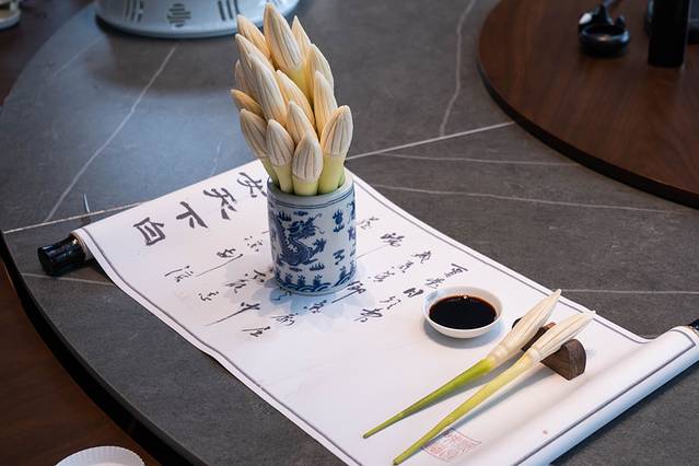一支支挂在笔架上的茭白,便称之为“越女天下白”,茭白毛笔沾点酱油,就像一只毛笔沾了墨,非常有意思。