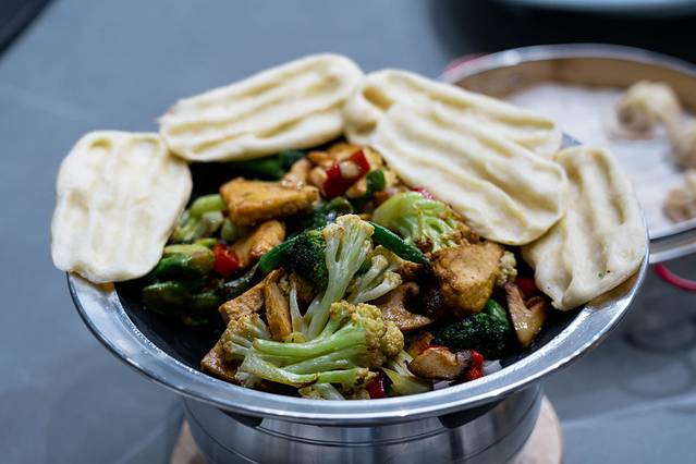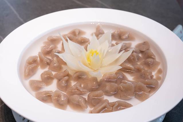一盘芋饺,外酥内滑,甘香适口,令人回味无穷,处于中心的荷花,上来时是含苞待放,热水浇灌后,花自盛开,被称为“荷花镜里香”,出自李白的《别储造之剡中》