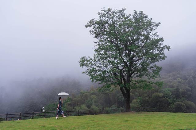 烟雨朦胧间、云雾缭绕,远山在迷雾间若隐若现,恍若人间仙境。
