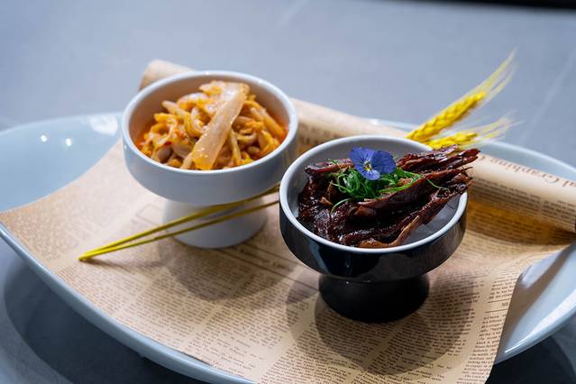 鲈鱼切片放入高汤,取名“此行不为鲈鱼烩”,鱼肉微辣、鲜美,看到这道菜品名,仿佛穿越了时空,和李白同食鲈鱼烩。