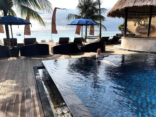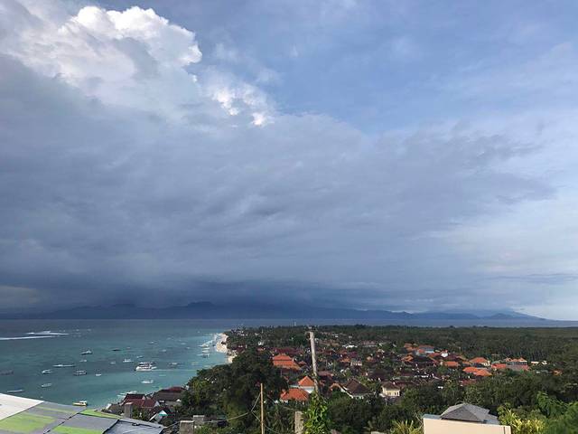 中午才退房 包的车来酒店接我们去坐船上蓝梦岛。下船后有小突突车举牌接人送去酒店,因为到了酒店已经下午2点所以办理的很快,护照办入住,在酒店前台定了第二天的浮潜和当晚的Spa,又租了摩托车。回房间整理好行李,去酒店泳池餐厅吃饭,摩托车去逛岛,天黑前回酒店,吃了晚餐直接去酒店的Spa馆按摩!爽爽的回房间吃水果看电视睡觉!