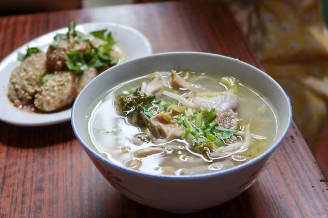 这家主打两样小吃:猪杂汤和糯米猪肠。猪杂和猪肠都处理得相当干净,糯米猪肠里包着板栗、芋头和香菇,吃起来满满的碳水感,蘸上红糖酱汁后,是甜咸口味。猪杂汤满满一大碗猪内脏,喝完真的好满足哦,汤里还有酸菜,解腻。