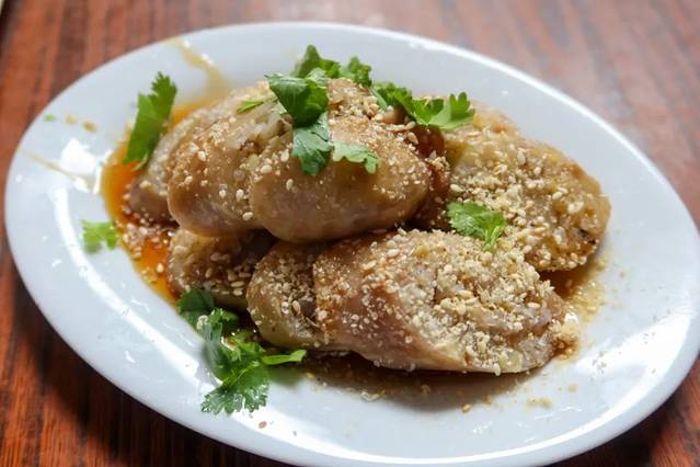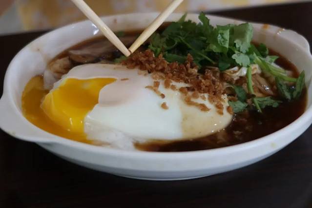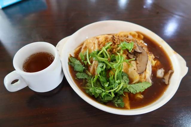 小店是夫妻店模式,叔叔制作,阿姨下单,我们站在一旁等待,时不时还听到他们拌两句嘴。因为每天人很多嘛,店主就只做1个品种的肠粉。建议大家要试一下加一个溏心蛋的吃法,粉皮薄薄地裹着流心蛋黄,酱汁里还有香菇和香菜。桌上有辣油,可以自己选择添加,增加风味,建议一丁点就够了,非常辣哦!随着餐点上桌的还有肠粉茶,也是当地餐饮特色。
