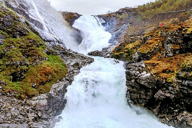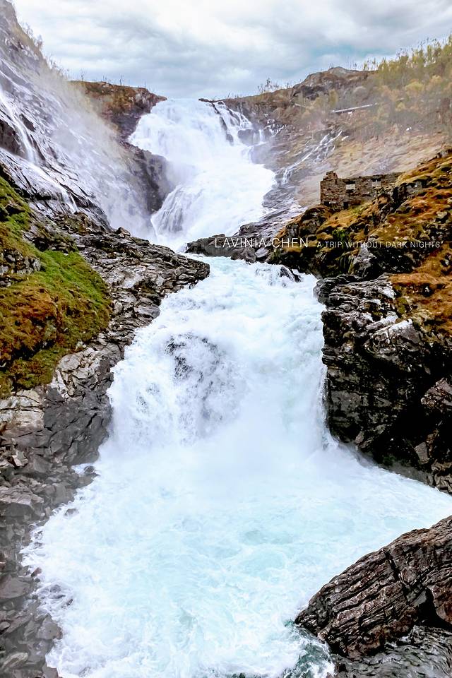 错过了跳舞,但是错过不了湍流的瀑布。瀑布的水很急,周边雾气很大,我们拍了几分钟,衣服表层上都是水。挪威真神奇,从此我们进入了瀑布的阶段。