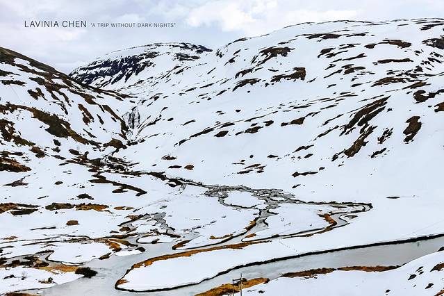 再往高处走,积雪越来越厚,河流反光也强烈很多,分不清是冰还是水。这就是这条铁路为什么是“欧洲最美火车旅行之一”吧,短短一个小时,带我们从夏天来到了严冬。