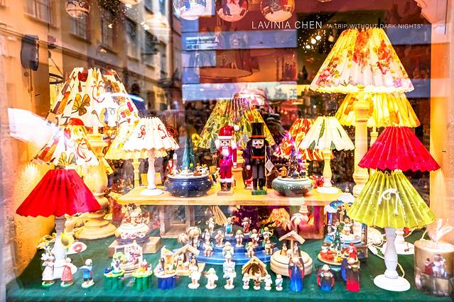这是一间售卖灯具的小店,灯罩被做成了各种裙子的样子,还有很多有趣的小玩偶。