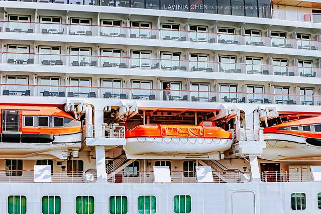 有些客人已经上船来到了他们的阳台上,还记得我高中的时候喜欢的一个男生周记里写过一句话:风景这个东西很有趣,你看别人的时候,你也成了别人眼里的风景。说的就是这个时刻吧,我们小船上的人抬头看向这位阳台上的女士,这位女士也在低头看向海上经过的我们。