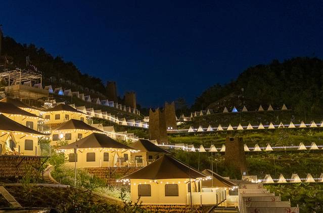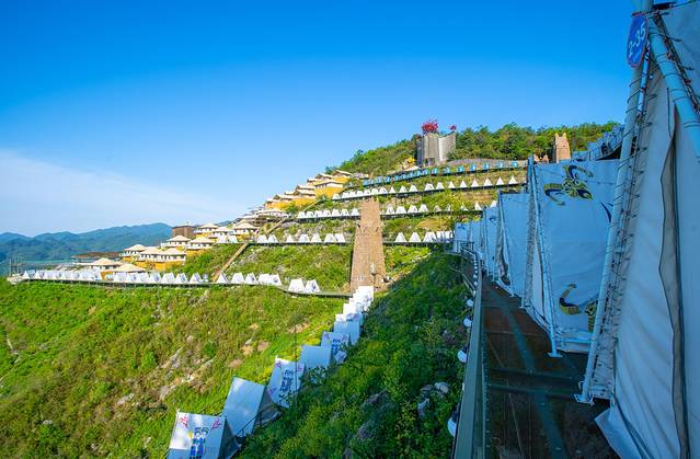露营地在景区山顶,我们没有多作耽搁便沿着山路向上走去,中途经过一个小吃街,简单的吃了一个小吃裹腹,便转乘上到山顶的索道直奔山顶而去。