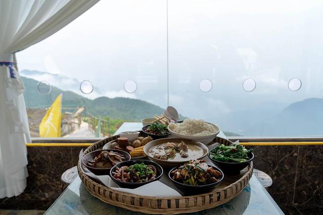 我们办理好住宿,放下行李,先去用餐,餐食是景区的特色簸箕宴,由一个簸箕装上美食,简单的美食也别有风味。欣赏着远山的风景,美食也变得格外享受。