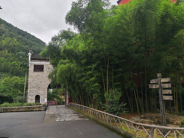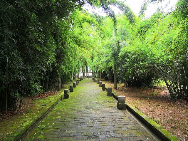 步行甬道,两侧竹林郁郁葱葱,石板路上布满青苔。