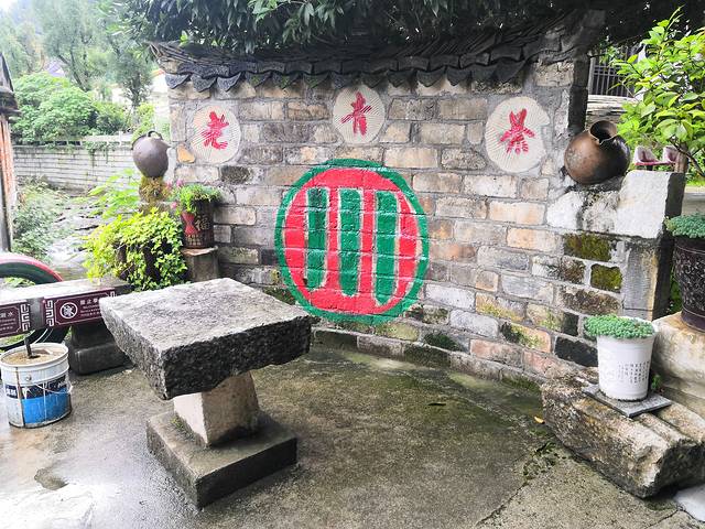 休闲的石桌,背景墙上的老青茶讲述小镇的故事。