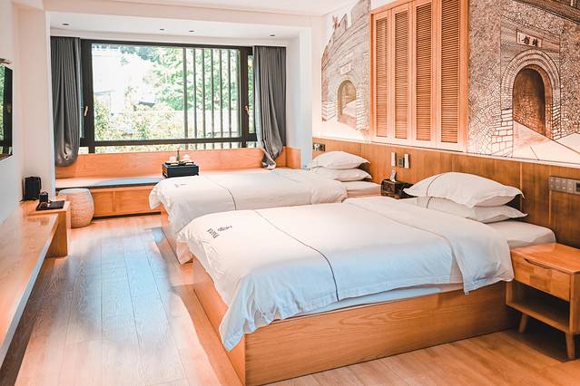 房间明亮开阔,原木构造,温馨舒适,台州府城元素融入其间,现代建筑设计与本土文化元素融合,轻奢雅致。