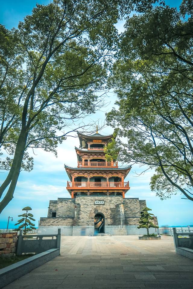望湖亭始建于晋太康元年(280),后屡嬗兴废。现在我们看到的望湖亭是2021年10月落成的,砖混结构,方形攒尖顶,飞檐挽云揽月,亭身回廓曲槛。上下四层,有28米高,整体建筑危江而立,气势恢宏。