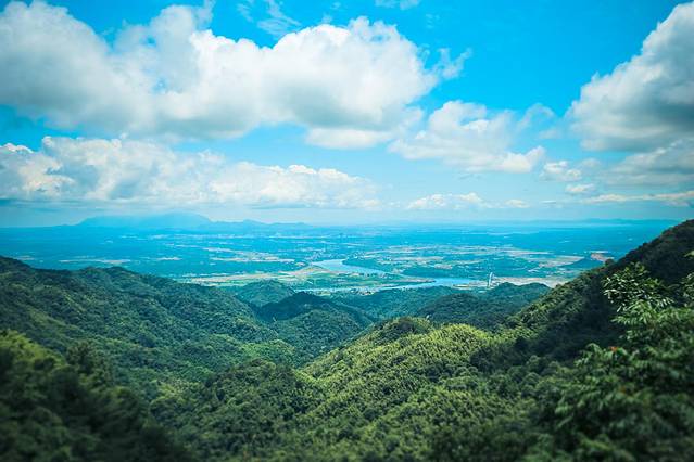 置身山中,欣赏山下的景色,蜿蜒的河流,静谧的村落,如世外桃源一般。我们那天刚好晴空万里,可以清晰地看见庐山的身影。