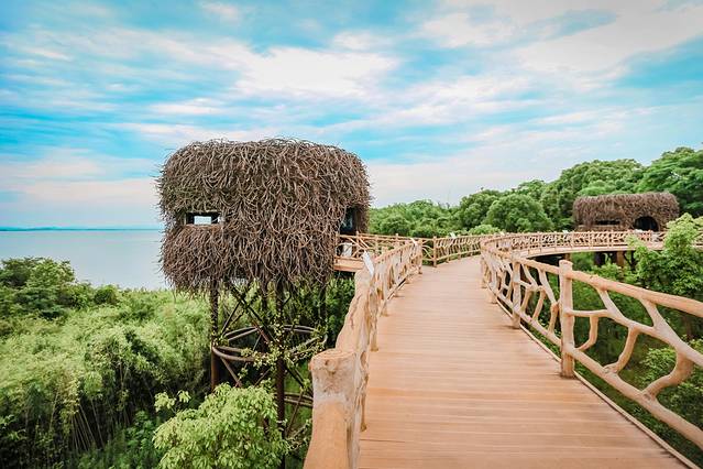 游人可以漫步于凌波栈道,它是“中国最美水上公路”的最佳“伴侣”,还创了世界最长户外水上竹栈道纪录。