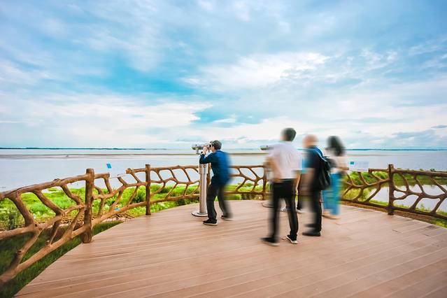 由于无法通车,便会有渡船来接驳游客往返游客中心与候鸟小镇之间。这个时候便可以换个角度,从湖面上欣赏这条绝美的水上公路。