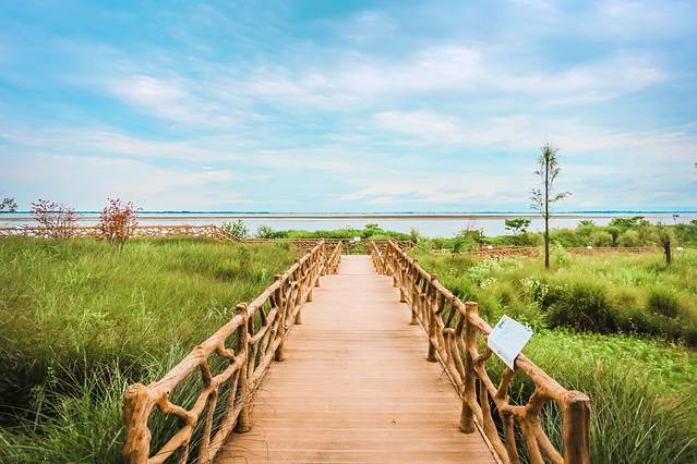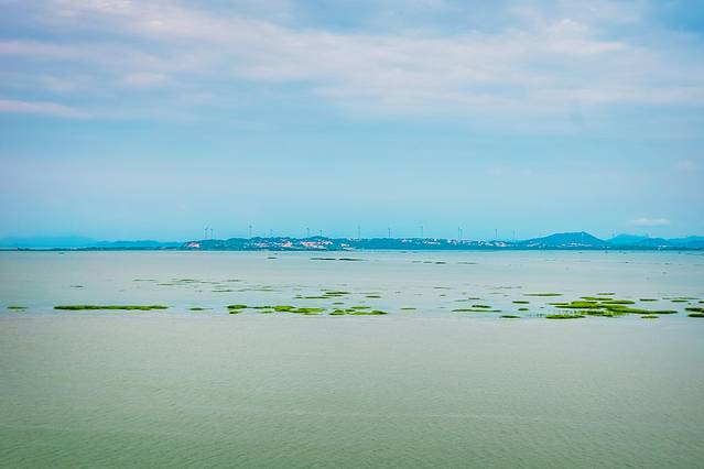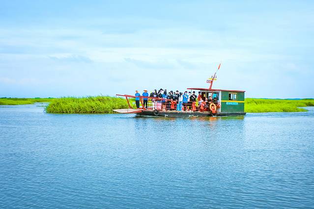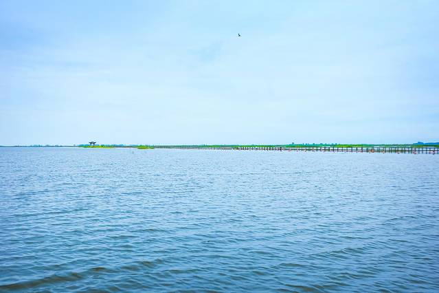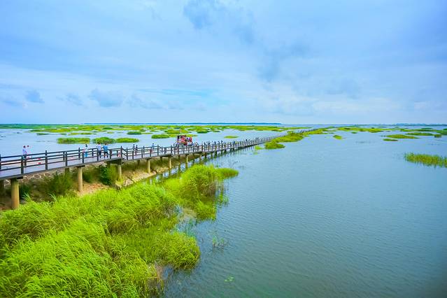 渡船行驶在广阔的湖面上,一边是翠绿的水草,一边是长长的水上公路,时而有鸟儿飞过头顶,公路上漫步的人儿,就像是悬浮在湖面上一样神奇。