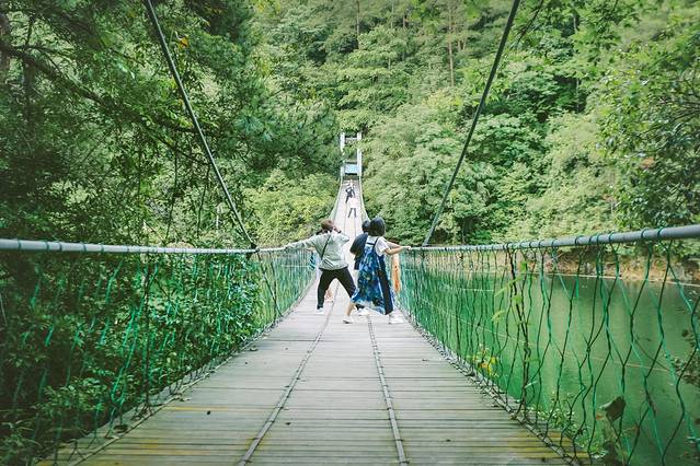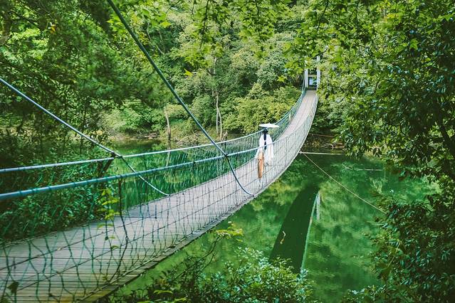 长长的铁索桥,越往中间走,越是晃得厉害。如果是情侣的话,这个时候就得抱紧对方了吧,哈哈!相互搀扶着走过这座情人桥,才是最好的打开方式啊!