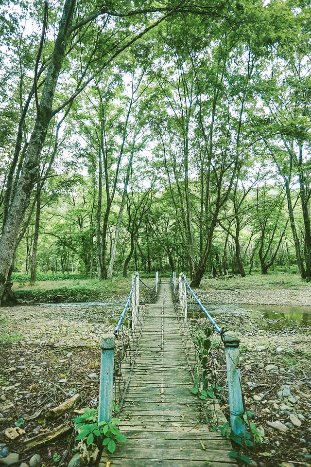 古木森森、溪流潺潺的千福滩原始森林,现在是枯水期,水量不是很充沛,但依旧很好玩。林中斜步飞板、铁链弹桥、秋千侧桥、悬梯等,或刺激或悠闲的游乐设施,可以让我们体会森林体育的刺激与快乐。还可以在清澈见底的溪流中踩踏软软的细沙,捡拾七彩卵石、捕捉水中虾蟹、观看戏水游鱼,聆听百鸟欢唱。和大自然零距离接触的感觉,真好!