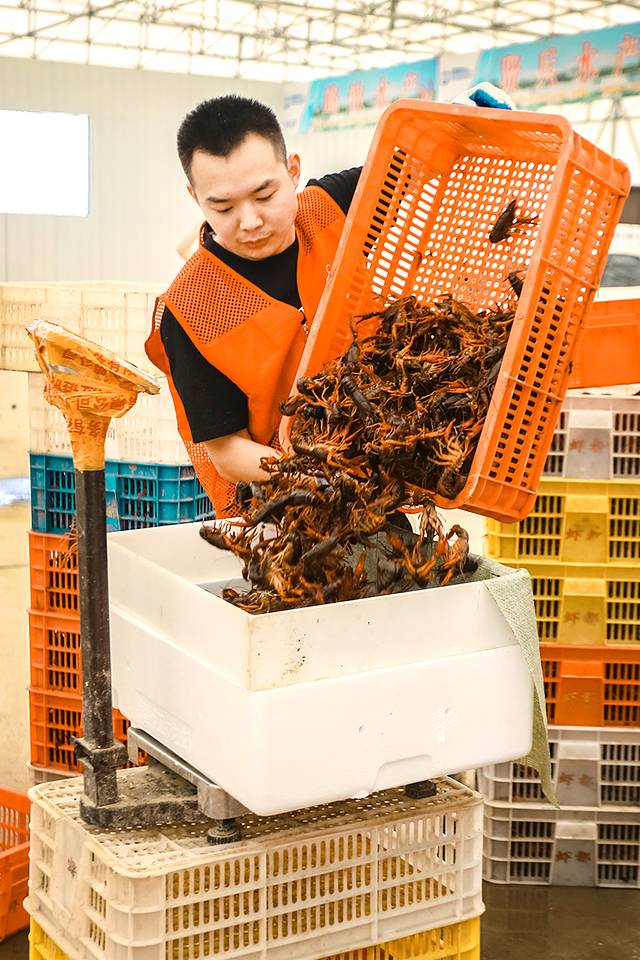 问渔民伯伯哪能买虾,想买些带回去吃,它告诉我们旁边就是小龙虾交易中心,那里就能买。来到交易中心,看到工作人员正在分拣小龙虾,每一个都在过称,大的能达到一两三钱一只。了解之后得知,它们的货运速度快,保鲜效果也好,全国各地的吃货们都可以采购。而且这价格是真心划算,比菜市、超市便宜多了。