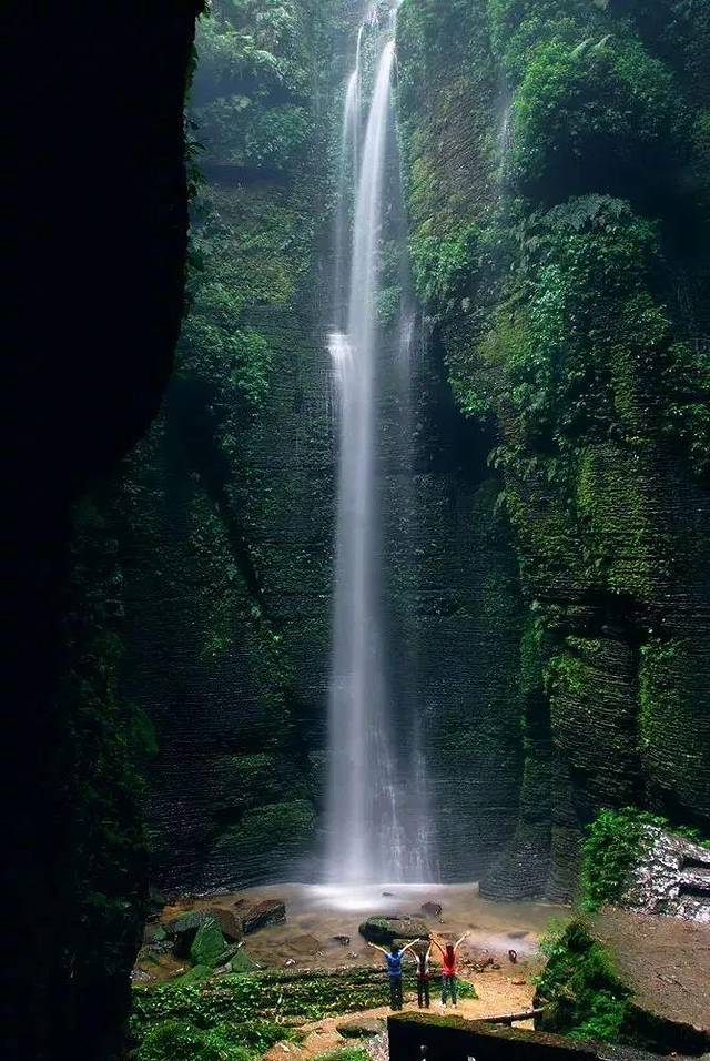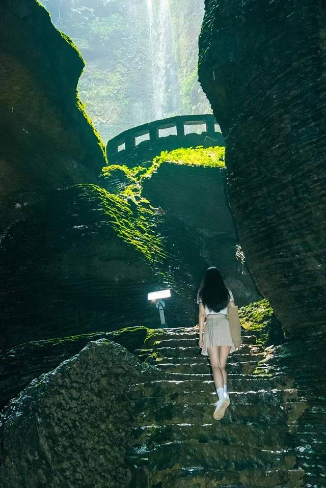 走出山洞,也是别有洞天,一道奔流的瀑布从洞顶直泄向下,声音如雷贯耳!