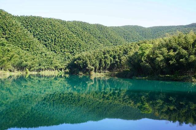 这里的湖水也是正儿八经的清澈见底,就像镶嵌在高山上的一面大镜子,将四周的青山、绿竹倒映在其中。