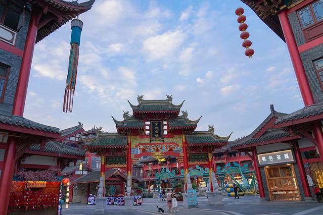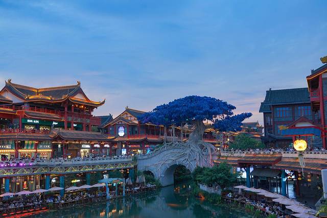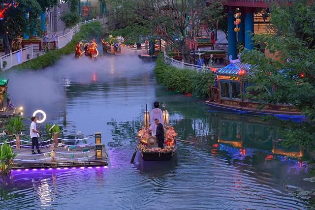 夜幕降临,蜿蜒的河流向前流去,两岸是古色古香的仿宋建筑,整条水街灯火辉煌,让人目不暇接。