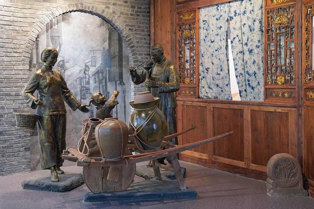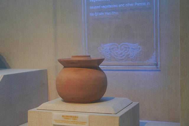 博物馆内还展示了很多泡菜坛子,几千年来,泡菜坛子的发展变化在这里一一展现。四川泡菜坛结构特殊,有坛沿,坛沿内盛水以密封坛口,而坛内发酵产生的气体又能通过水逸出,避免有害微生物的侵入,开启方便而又清洁卫生。以前我只知道在坛沿加水,这一次在博物馆看到在坛沿加盐的,解说员说效果是一样的,只是水几天就要加一次,而盐更方便一些。