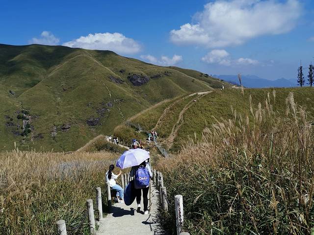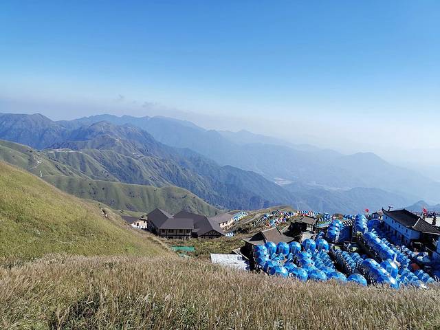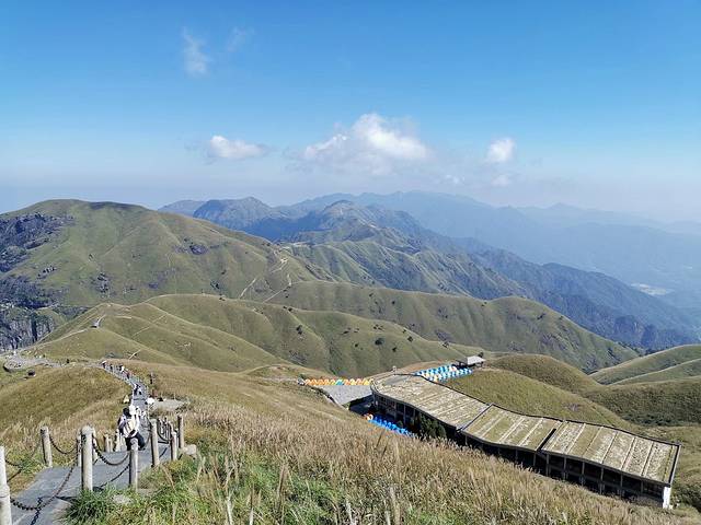 早上10点多从南昌往萍乡走,下午3点抵达武功山脚下。山脚下风光无限,看得见不高的山顶和层叠的山峦,还有水库、加上蓝天白云的加持,对草甸充满了期待和幻想。