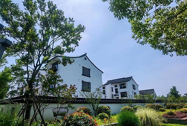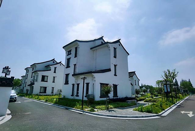 示范村果然与众不同,活脱脱的一个城里别墅小区的构筑风范,白墙、灰瓦、坡屋顶,原汁原味的江南民居风格,使得整个小区在茫茫的田园中,显得格外的醒目,远远的就能看得到。