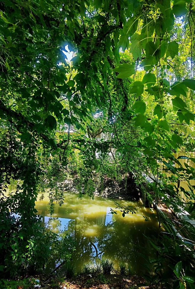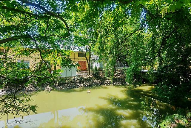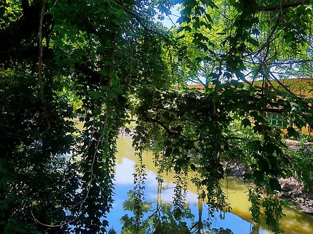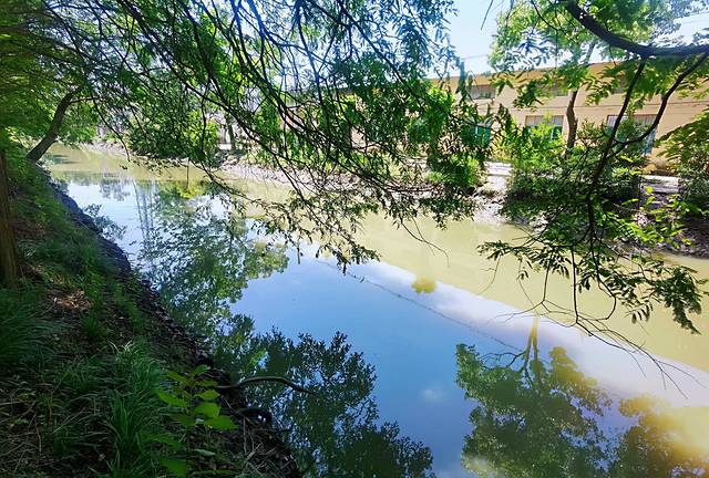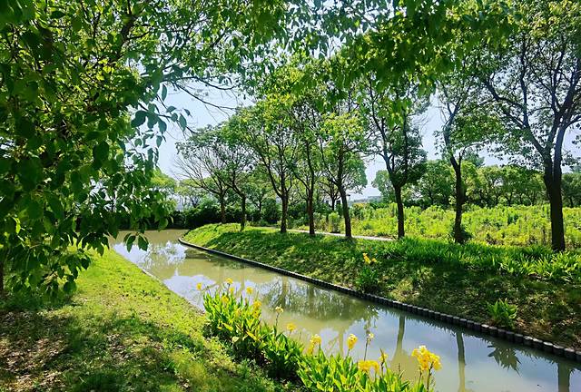 村的北面,在村和东川路之间,有一个过渡区域,在这个区域,有一个野趣盎然的自然生态湿地,这个区域中间是一条河道,河道两岸有栈道,有一座小石桥连接着两岸,小河两边树林阡陌、野草野花自然生成,花蝴蝶、小蜜蜂漫天飞舞,田野里还有一座废弃了的大石桥,路口有一座同心亭,走进这样的环境里,感觉很轻松,也很惬意。