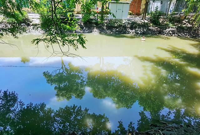村外有条小河,岸边的绿树,葱葱郁郁,透过茂密的树荫下,可以隐隐约约的看到对面掩映的民房,河面上倒映着蓝天、白云、还有翠绿的树影;一阵微风轻轻吹过,平静的河面上,顿时泛起了涟漪,倒影变得模糊不清,一会儿河面恢复了平静,一切又静悄悄了。