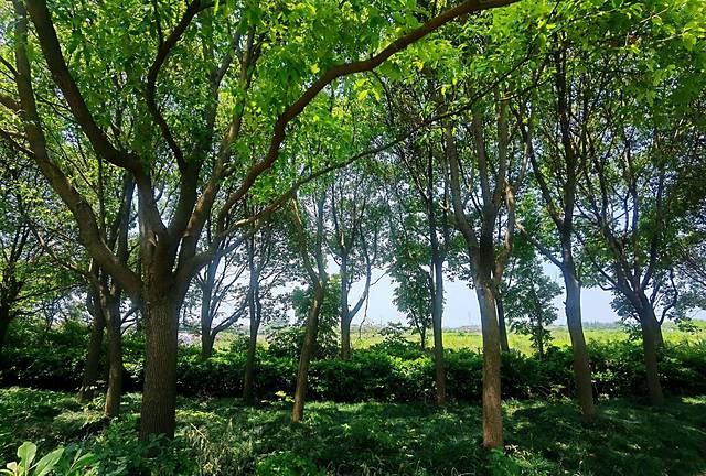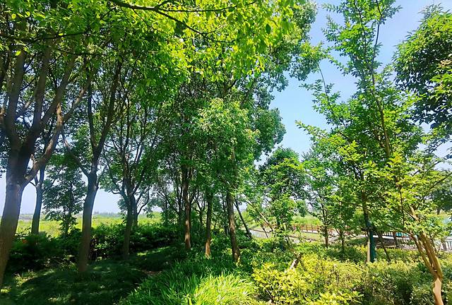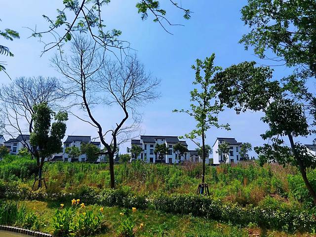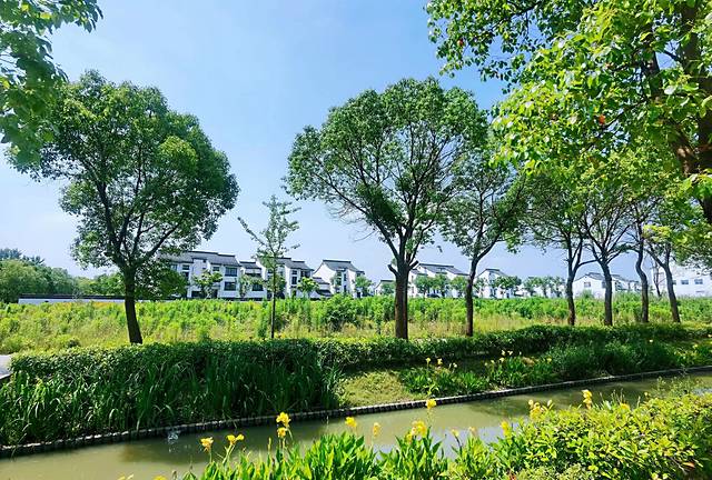 型式的合抱了整个村庄。东面隔着河道,可以看到一大片农田,西面紧连着汇江路,与民主村隔路相望,南面邻河,河岸上建有一座小花园,种植着各种绿树花卉,有一条蜿蜒的步道,还有一座无名小亭子,同心村村外风景最有看点的,应该是北面了。