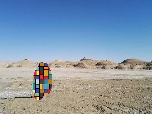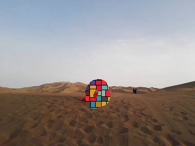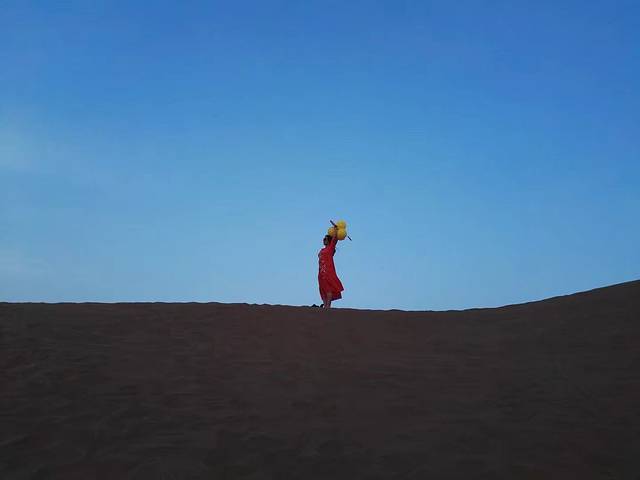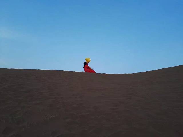 晚上6点抵达库木塔格沙漠,零星的人出出入入。门票30块,区间车30块。沙漠整了个俗气的新大门,湖水边还有泥沙,时间不够慢行,便坐了区间车进去。刚开始天是灰蒙蒙的,过了一阵子,慢慢的出现了蓝天,沙子的确是轻轻柔柔的,找一块纹路清晰的沙漠,脱了鞋袜,光脚在沙子里软软的行走,好不惬意。可惜相机突然没电了,想哭,为我的裙裙。拖鞋也在沙子里失踪了,了无踪迹,可能它不想跟我回家吧。