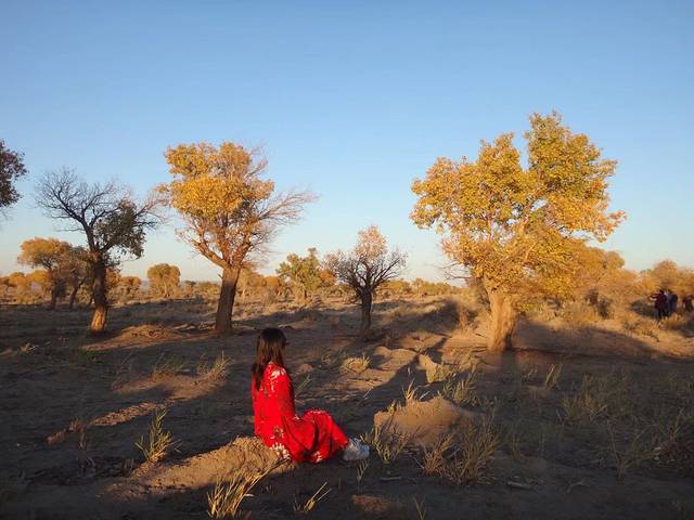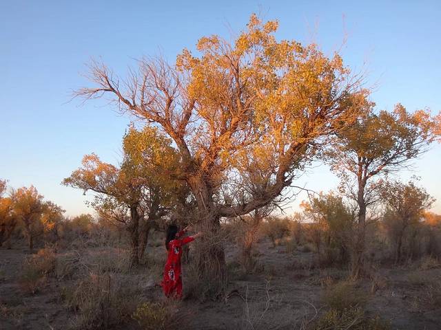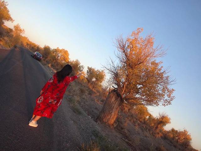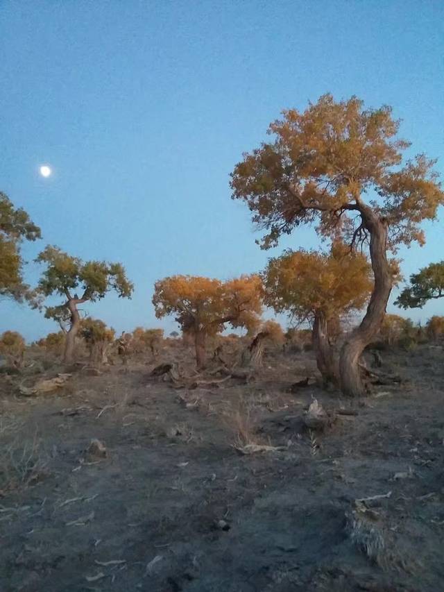 到淖毛湖,错过哈萨克族的婚俗表演。47万亩胡杨林分为一千年区,三千年区,六千年区,九千年区,里面35公里的路,门票35块,自驾车一个车50块进去,区间车也是50块/人。一千年区的胡杨已经让人惊艳,追着光,拍拍停停看看,一个多小时就过去了,在日落时分,我们才刚刚到三千年区。三千年区开始有少量的枯树,树枝扎人,服务区不见人影,唯月光很好,晚霞漫天。夜里在车灯照耀下,瞅见六千年区些许荒凉,两个区间都不见密密麻麻的树干,九千年区的老树精坐如卧佛,苍凉粗壮。