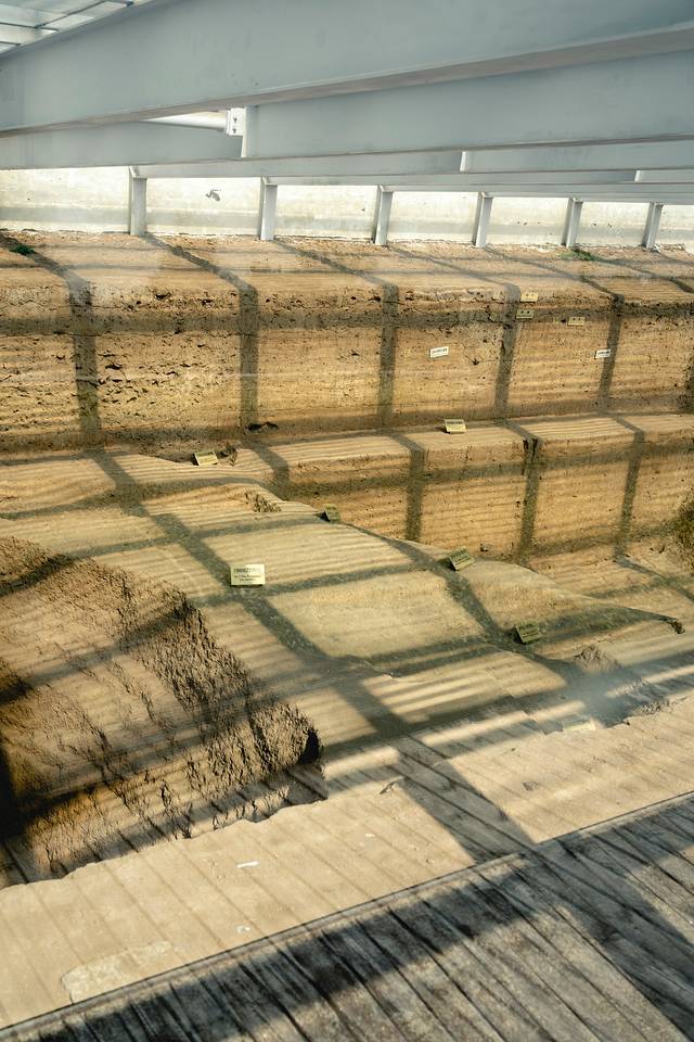 东城门出去,绕大伾山走一公里,便从市巷喧闹进入了荒草蔓蔓。伾山大佛视线的阴影里,躺着几个透明的玻璃罩,底下埋藏着隋代大运河畔的“北方第一转运仓”黎阳仓。与明代全面重建的古城相比,这里显得古朴原始得多。古老的黄色隐没在玻璃之下,直削削的刻痕声明着人工开凿的痕迹,只是不见其他人,诺大的荒野上只有我和一些昆虫草木的窃窃私语。从熙熙攘攘的古城到荒草覆盖的旷野,十几分钟的路程,双脚踏过了五百多年光阴。