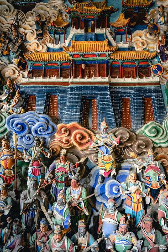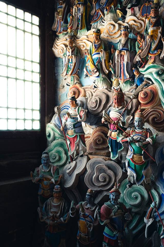 还有山顶的万仙阁,远远望去,便被满墙飞舞的悬塑人物所惊艳。沿梯踱至二楼,光景亦然。这样浩大的悬塑群,理应在文物图谱上占有一席之地,可为何从未听说过呢?问及院内的老者,方知这万仙阁虽始建于清代,其中悬塑却是新近重修。这近可碰触的年岁,也便剥夺了它在文人口中的地位。